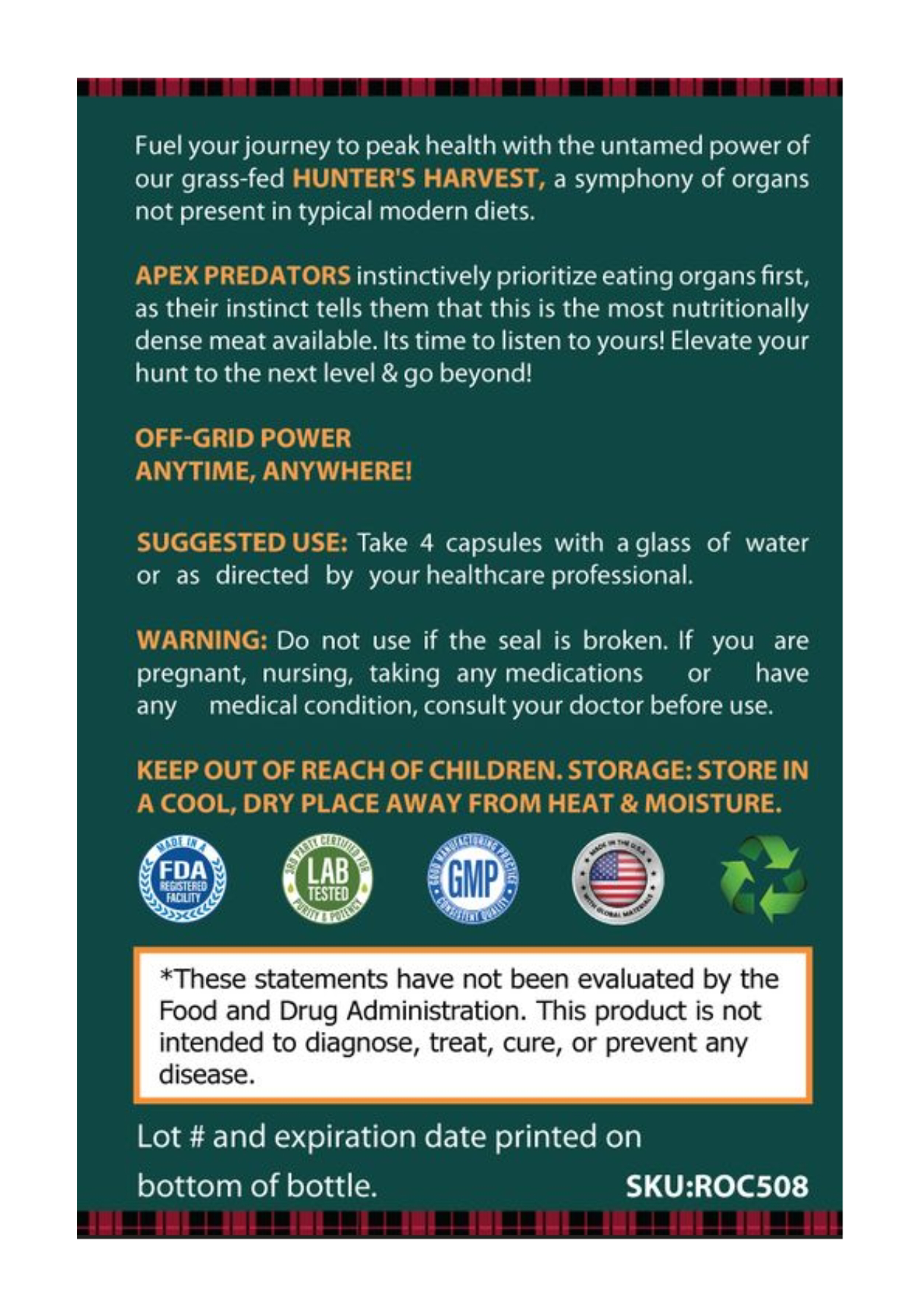 HUNTER'S HARVEST - Grass Fed Beef Organ is formulated to support natural energy, healthy blood sugar, digestion, exercise performance, immunity, cognitive health, thyroid health, and total body wellness. Our product is synthesized utilizing the latest scientific research and formulated with optimal ratios of grass-fed beef organs to support natural energy, healthy digestion, exercise performance, immune function, cognitive health, thyroid function, and overall well-being. Our grass-fed beef organ complex is packed with essential nutrients such as B-12, iron, zinc, vitamin A, omega-3, choline, selenium, copper, vitamin E, retinol, alpha-GPC, magnesium, digestive enzymes, essential amino acids, CoQ10, and B-vitamins, making it an excellent source of nourishment for your body. Our formula is third party independently tested for heavy metals, impurities, made in the USA, GMP certified, and produced in an FDA registered facility. 1% of the supplements on the market can match our world class standards. Our Formula is hormone & pesticide free, and non-GMO. |